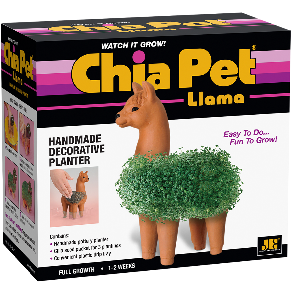 The Original Llama Chia Pet is a vintage icon ready to be your new fluffy friend! Great for both kids and adults, Chia Pets make for a fun and interactive activity as you plant your chia seeds and watch them sprout within days. This terra cotta llama planter has legs, a tail, and a sweet face with painted eyes and nose. In just a couple weeks, your Chia Pet will grow a luscious green coat that resembles the fur of a real llama! Whether you’re looking for a fun gift for a friend or a quirky addition to your own collection, the Chia Llama is sure to delight!