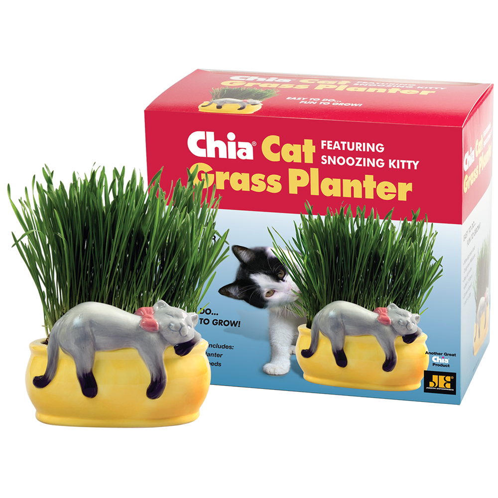 Here’s a fun and easy way to grow a fresh and healthy treat for your feline friend! The Snoozing Kitty Chia Cat Grass Planter is an adorable, eye-catching addition to your home décor. With a beautiful glazed sheen, this yellow planter features a happy gray cat doing what a cat does best… catching some ZZZ’s! This cat is even wearing a pink bow collar for extra cuteness! Cat grass is a satisfying and interactive treat for your cat and is easy to grow. Once you plant your seeds, grass sprouts within a couple days and grows about an inch per day. Your cat will love nibbling these tender blades of healthy grass. It’s the purr-fect gift for any cat lover!